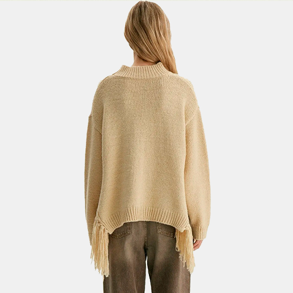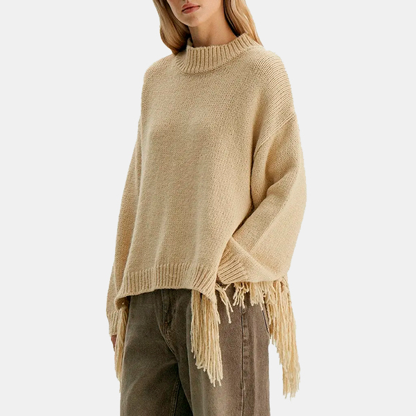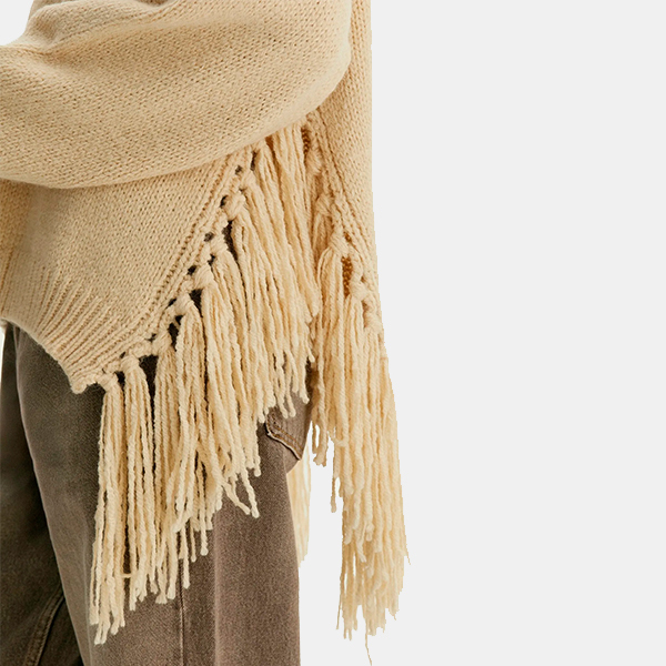 Бохо-джемпер с бахромой станет основой повседневных образов. Свободная модель со спущенным рукавом не стесняет движений. Широкая вязка резинкой по горловине и низу делает его ещё уютнее. Материал сделан с добавлением шерсти и нейлона, который помогает сохранять форму. Универсальный бежевый цвет позволяет сочетать вещь с большим количеством разных вариантов низа: например, шоколадными брюками из вельвета или базовыми джинсами серо-бежевого оттенка. Состав: 77% акрил, 9% нейлон, 8% шерсть, 6% polyester