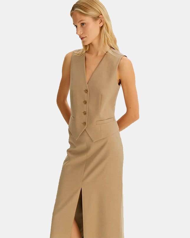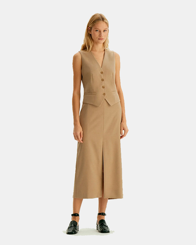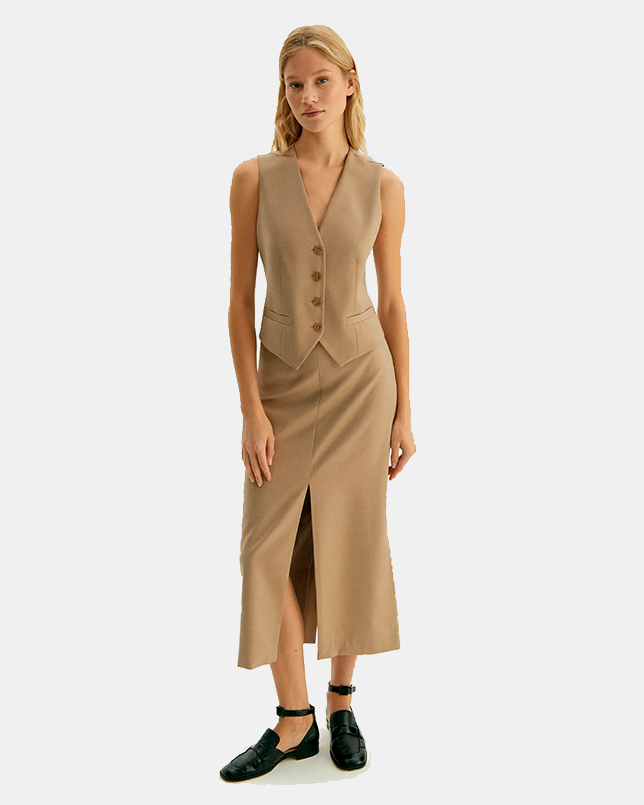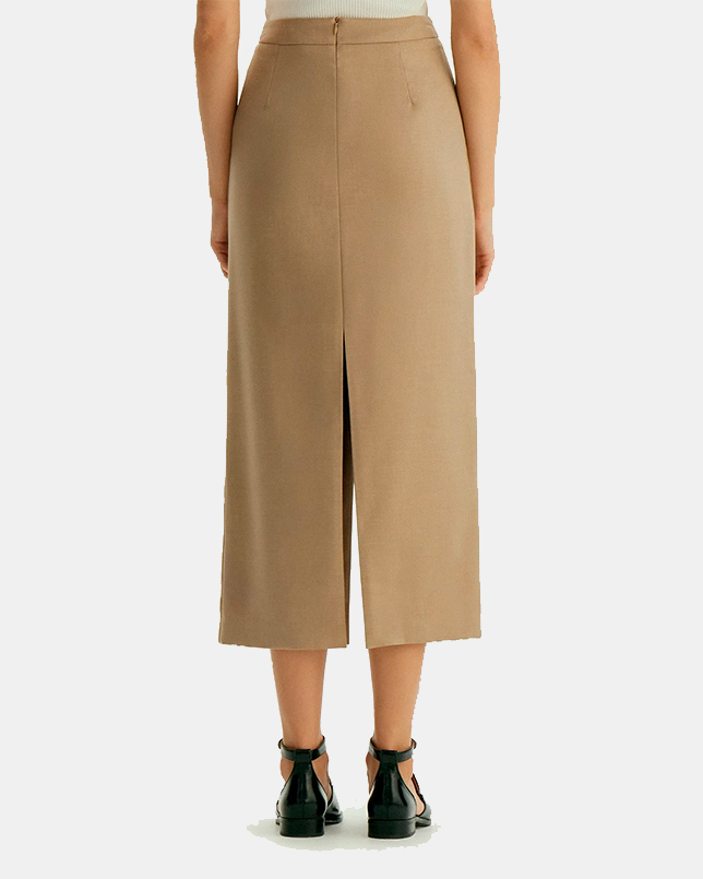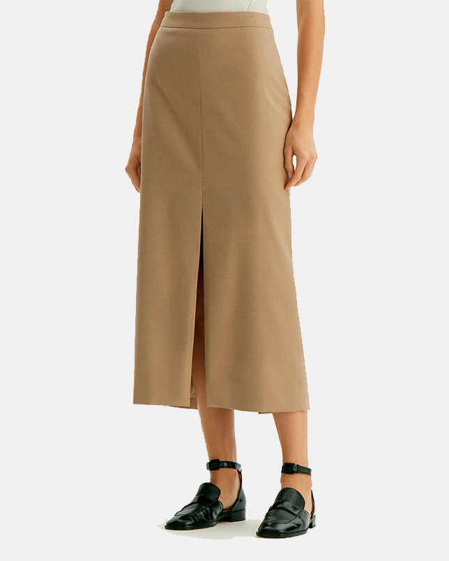 Элегантная базовая юбка на каждый день. Богатый оттенок бежевого сделает деловые образы ещё более стильными. В составе материала — шерсть для тепла, вискоза для мягкости и эластан для комфортной посадки. Юбка-карандаш в длине миди с высокой посадкой имеет разрез спереди. Состав: 44% полиэстер, 41% вискоза, 12% шерсть, 3% эластан