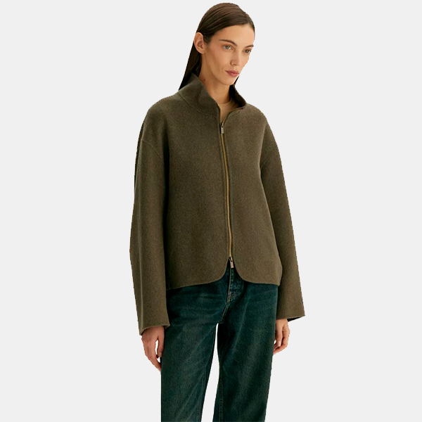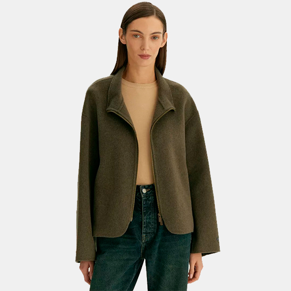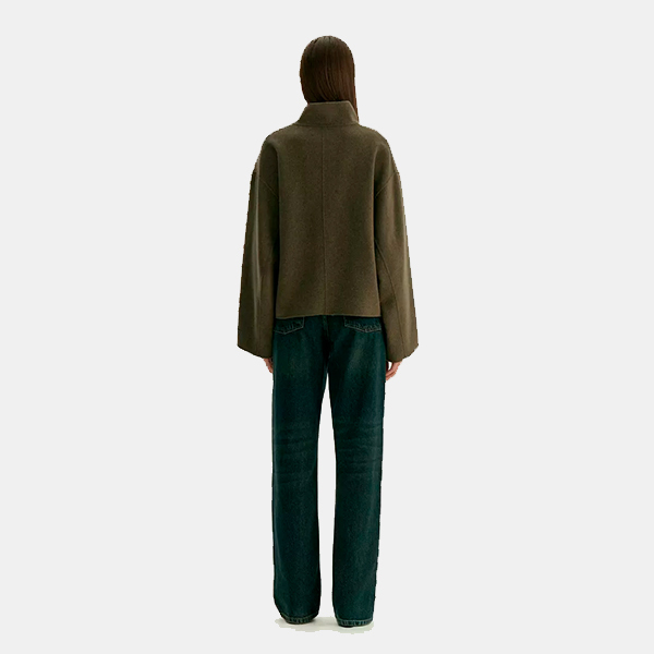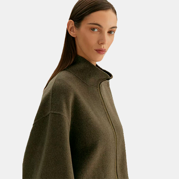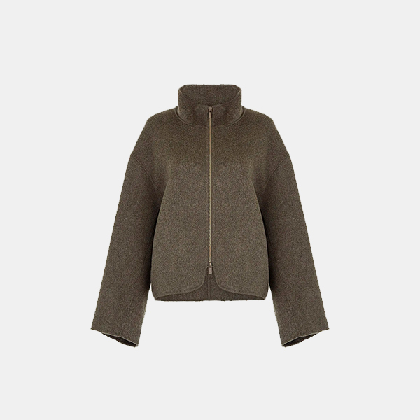 Пальто из шерсти и кашемира Укороченное пальто на молнии для стильных и удобных демисезонных образов. Длинноворсовая шерсть с добавлением кашемира даёт тактильно интересную фактуру. Цвет хаки всегда актуально смотрится. Модель со свободными рукавами и широкой проймой хорошо подходит для осенних многослойных образов, образов с рубашками и жакетами. Воротник можно поднять как стойку или разложить по плечам. Красиво скруглённые борта придают образу мягкости, уравновешивая прямой силуэт. Пальто отлично смотрится с джинсами и другим базовым низом. Сделано без подкладки. Состав: 70% шерсть, 10% кашемир, 10% полиэстер, 5% вискоза, 5% нейлон