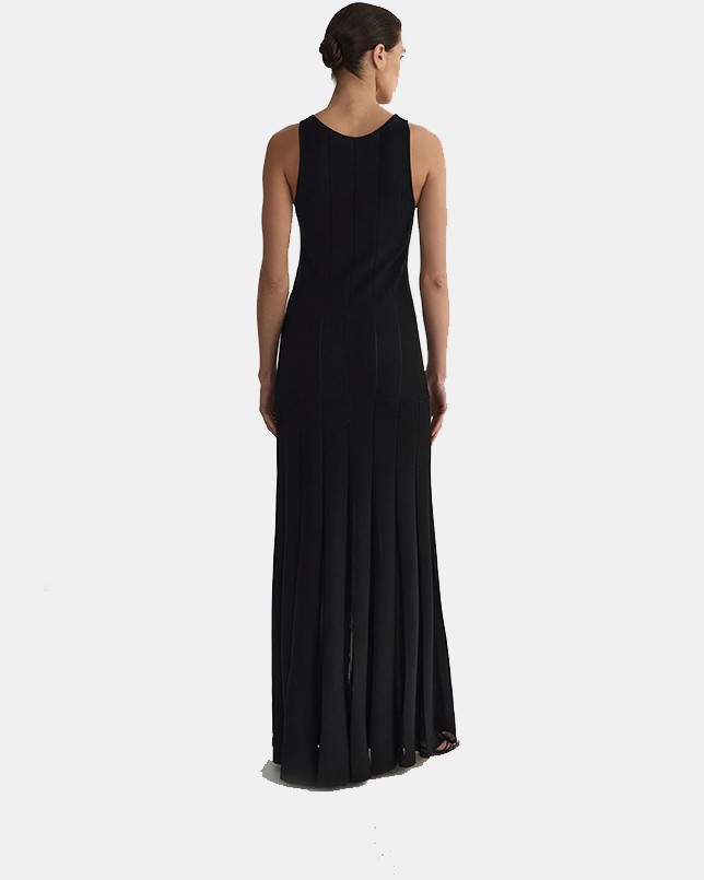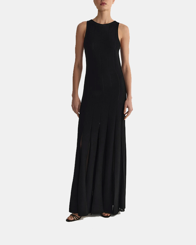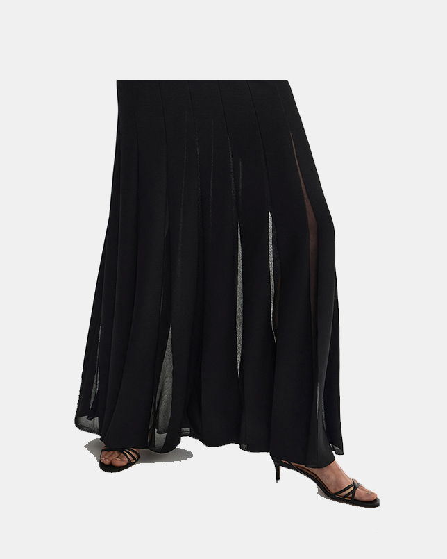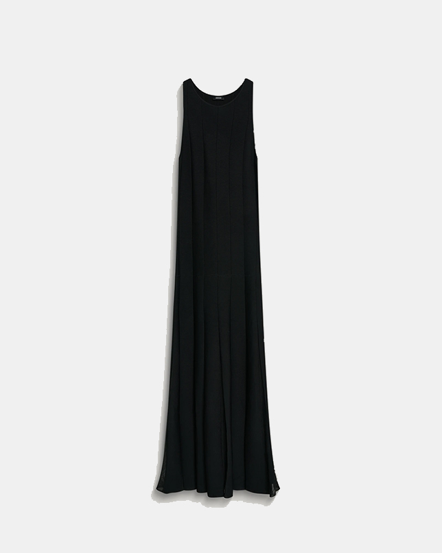 Приталенное платье с клиньями из прозрачной пряжи. Длина макси, открытые плечи и вертикальные полосы, идущие от горловины изделия до клиньев, визуально вытягивают силуэт. Состав: 78% вискоза, 17% нейлон, 5% полиэстер