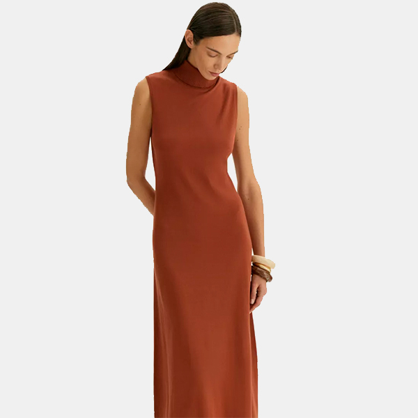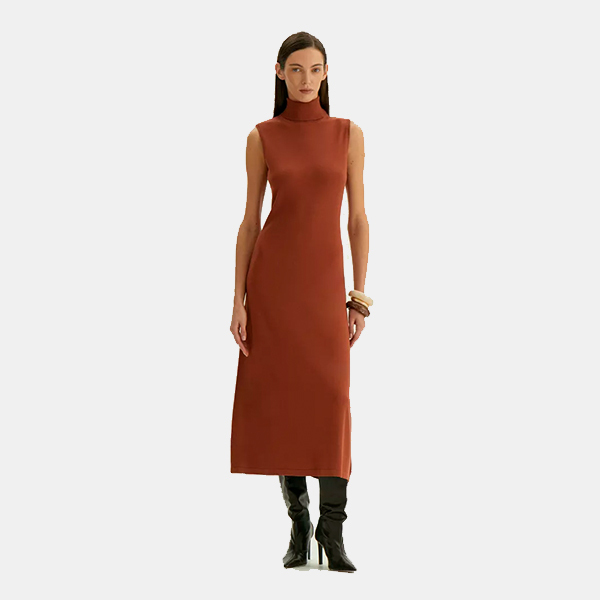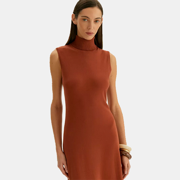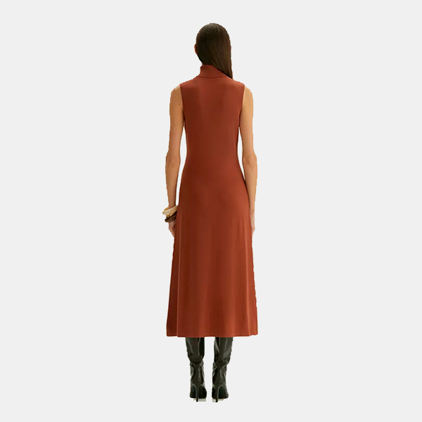 Незаменимая вещь для базового гардероба к межсезонью и зиме — вязаное платье мидакси без рукавов и с высоким горлом. Ворот защищает горло, а удобные глубокие проймы идеальны для образов с жакетами, кардиганами и верхней одеждой. Приталенная модель красиво садится по фигуре, воротник изящно охватывает шею. Мягкий материал тонкой вязки сделан на основе комфортной к телу вискозы. Терракотовый цвет поддерживает тренды сезона в образах и создаёт ощущение тепла. Платье универсально и имеет широкую сочетаемость. Подходит на каждый день и для особых случаев. Состав: 80% вискоза, 20% полиамид