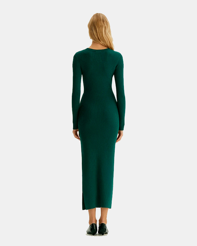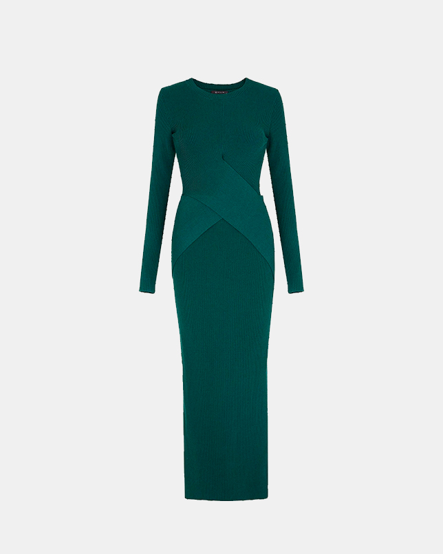 Трикотажное платье макси с драпировкой зеленого цвета. Вязаное платье на каждый день в зелёном цвете. Идеальный вариант для plus size и не только, формирует эффектный силуэт с акцентированной талией. Приталенная модель миди с имитацией запаха имеет неглубокий круглый вырез, длинные облегающие рукава и небольшой разрез на юбке. Состав: 65% вискоза, 31% нейлон, 4% спандекс